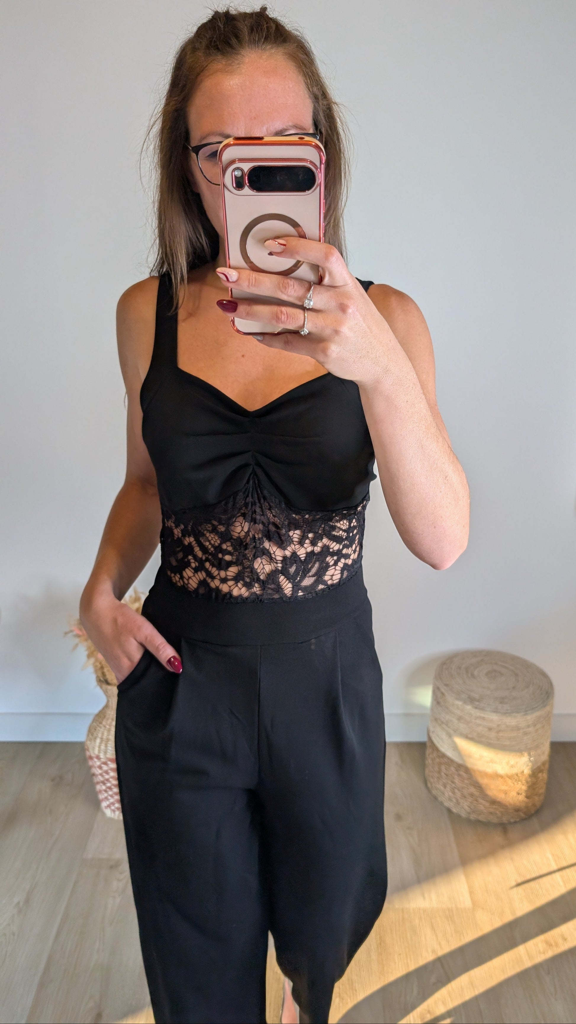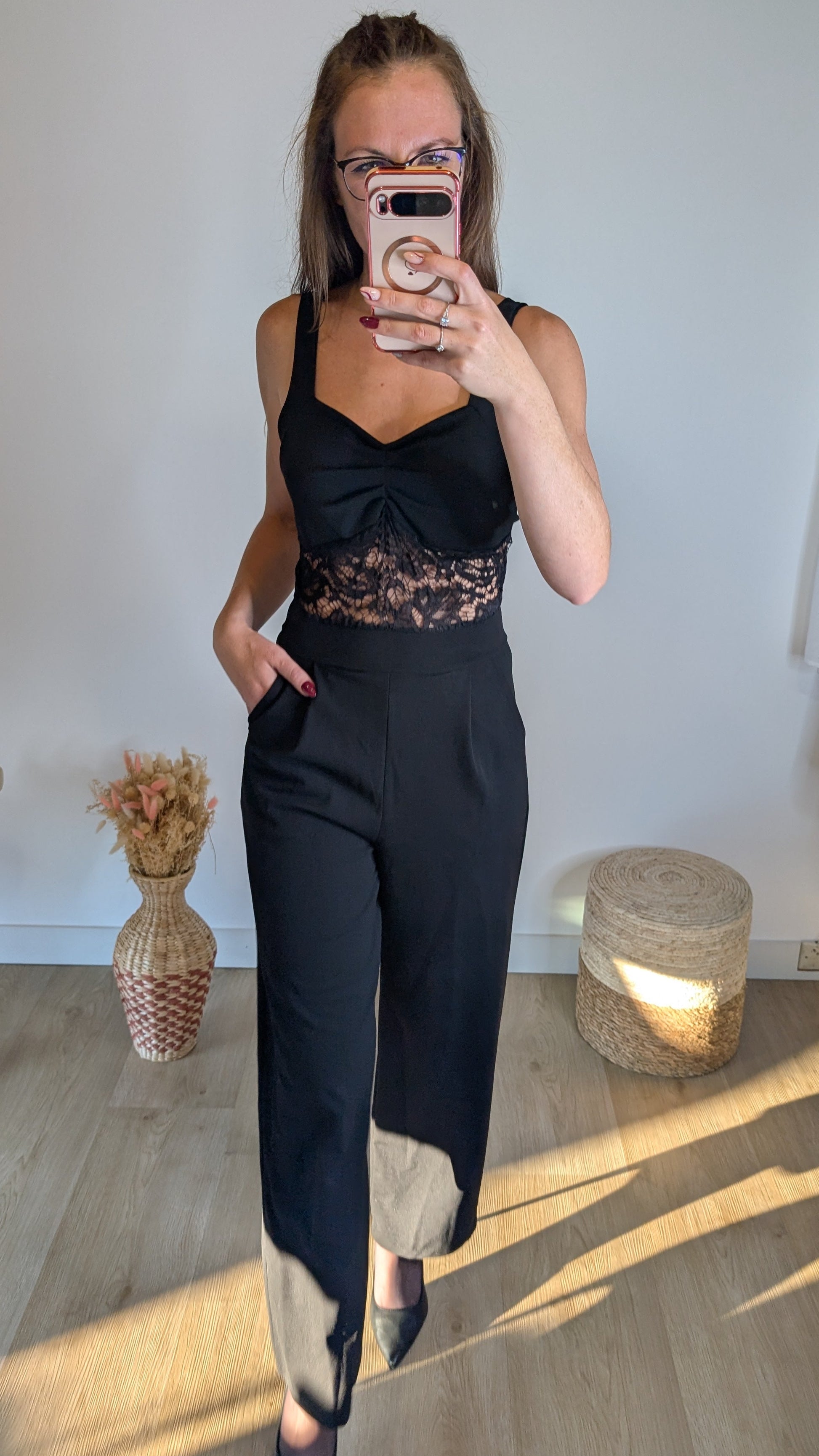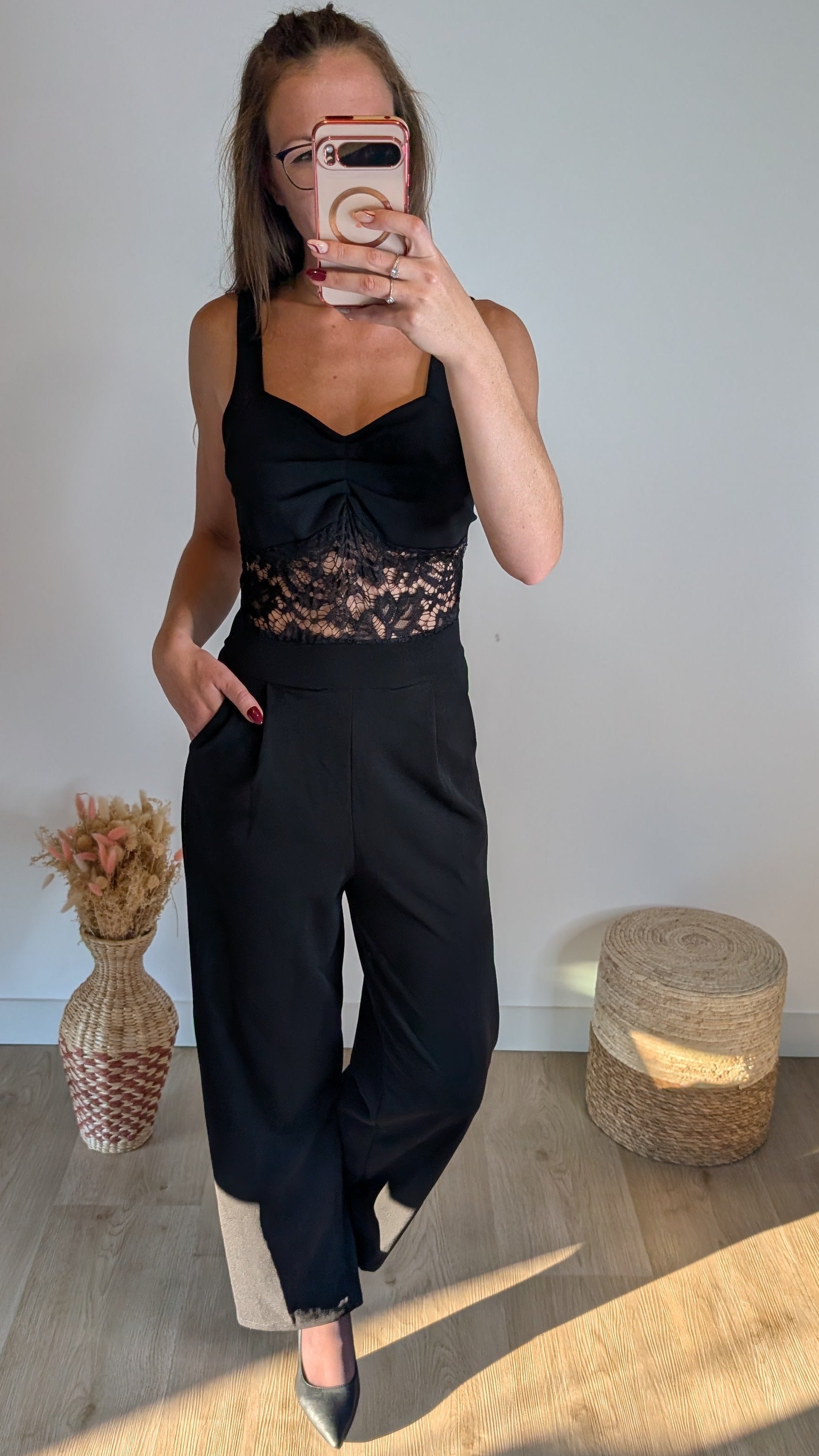 Sublimez votre silhouette avec cette combinaison noire au style chic et raffiné. Conçue pour allier féminité et modernité, elle se porte aussi bien lors d'une soirée habillée que pour un événement spécial.