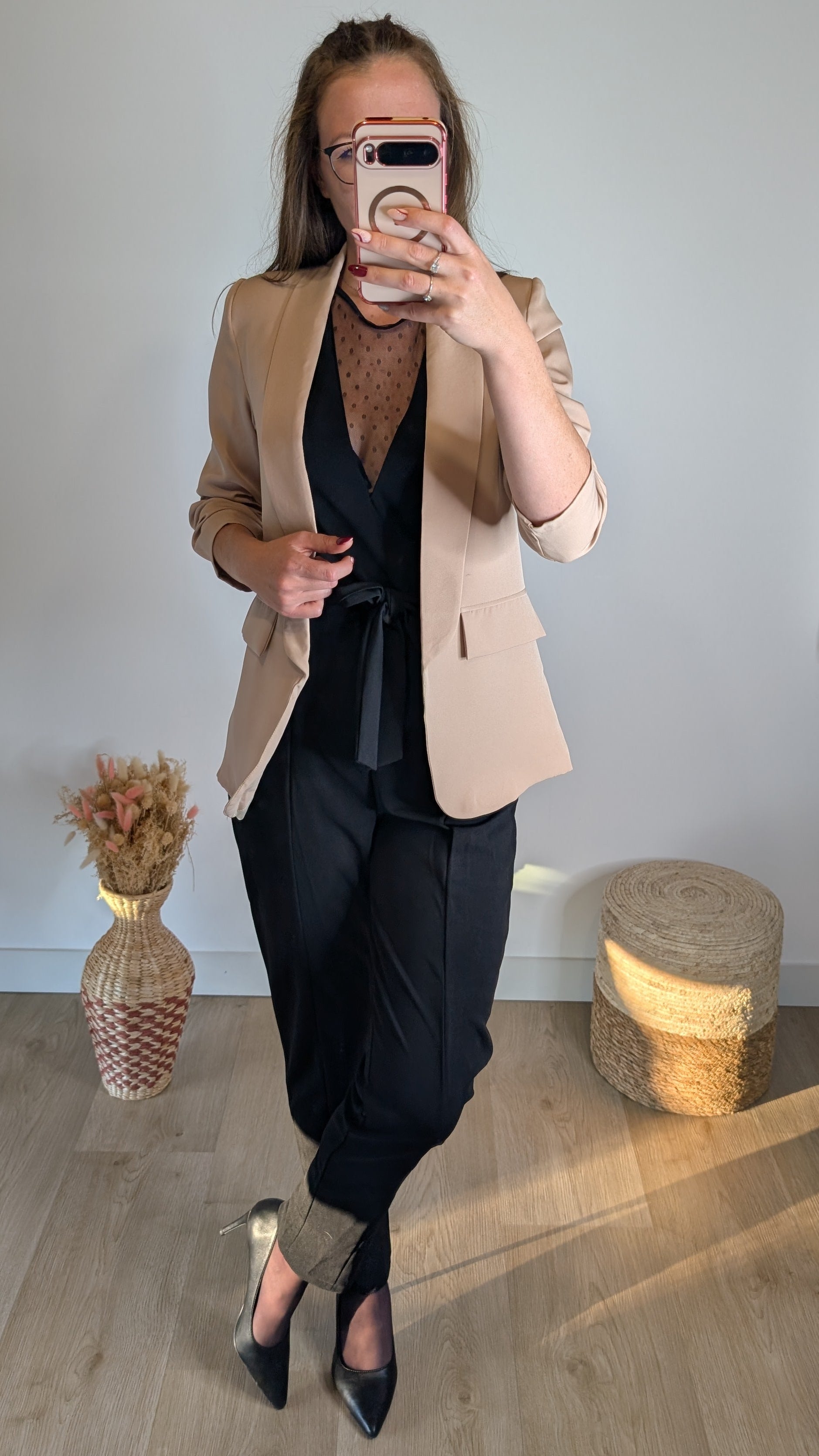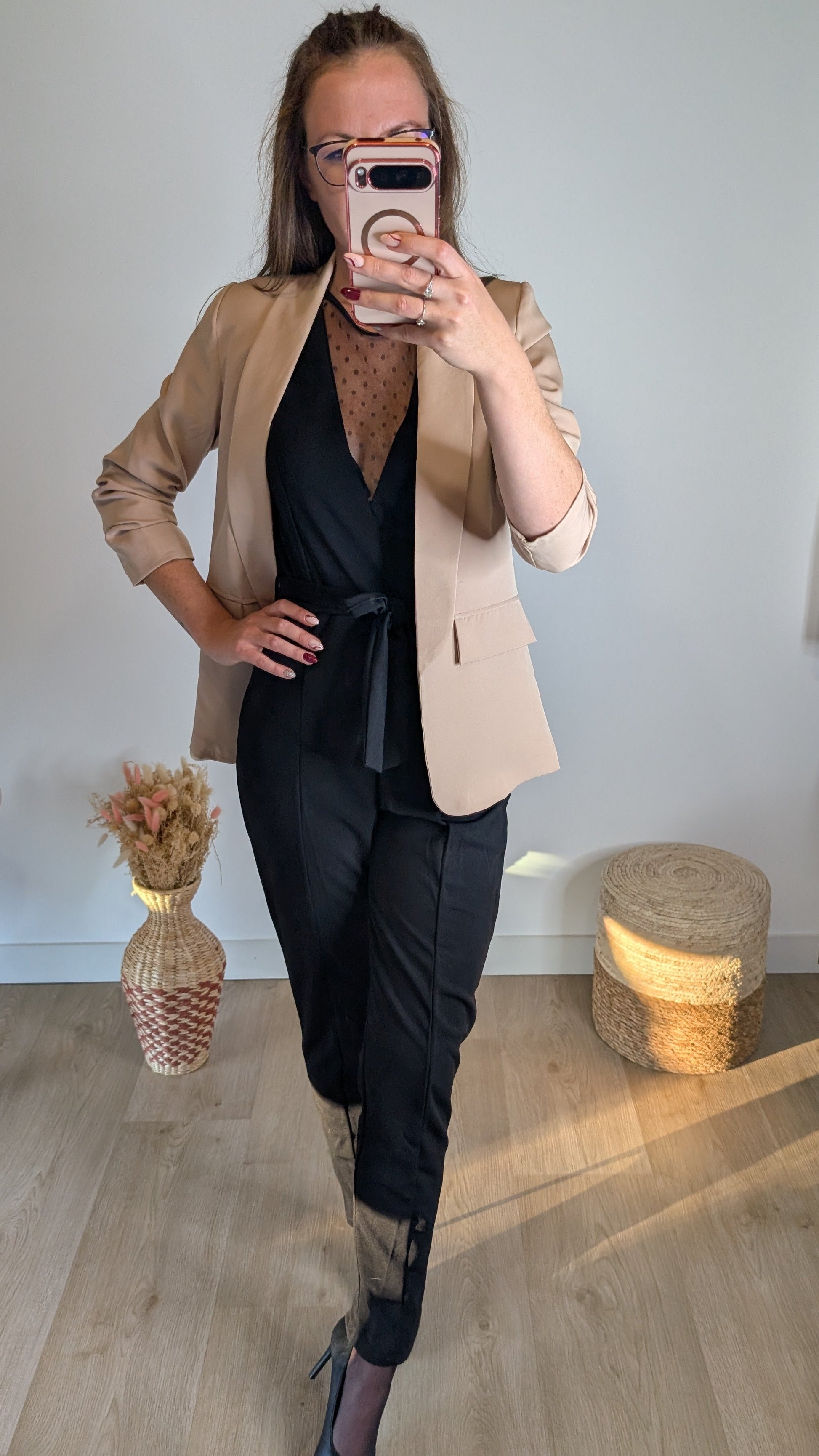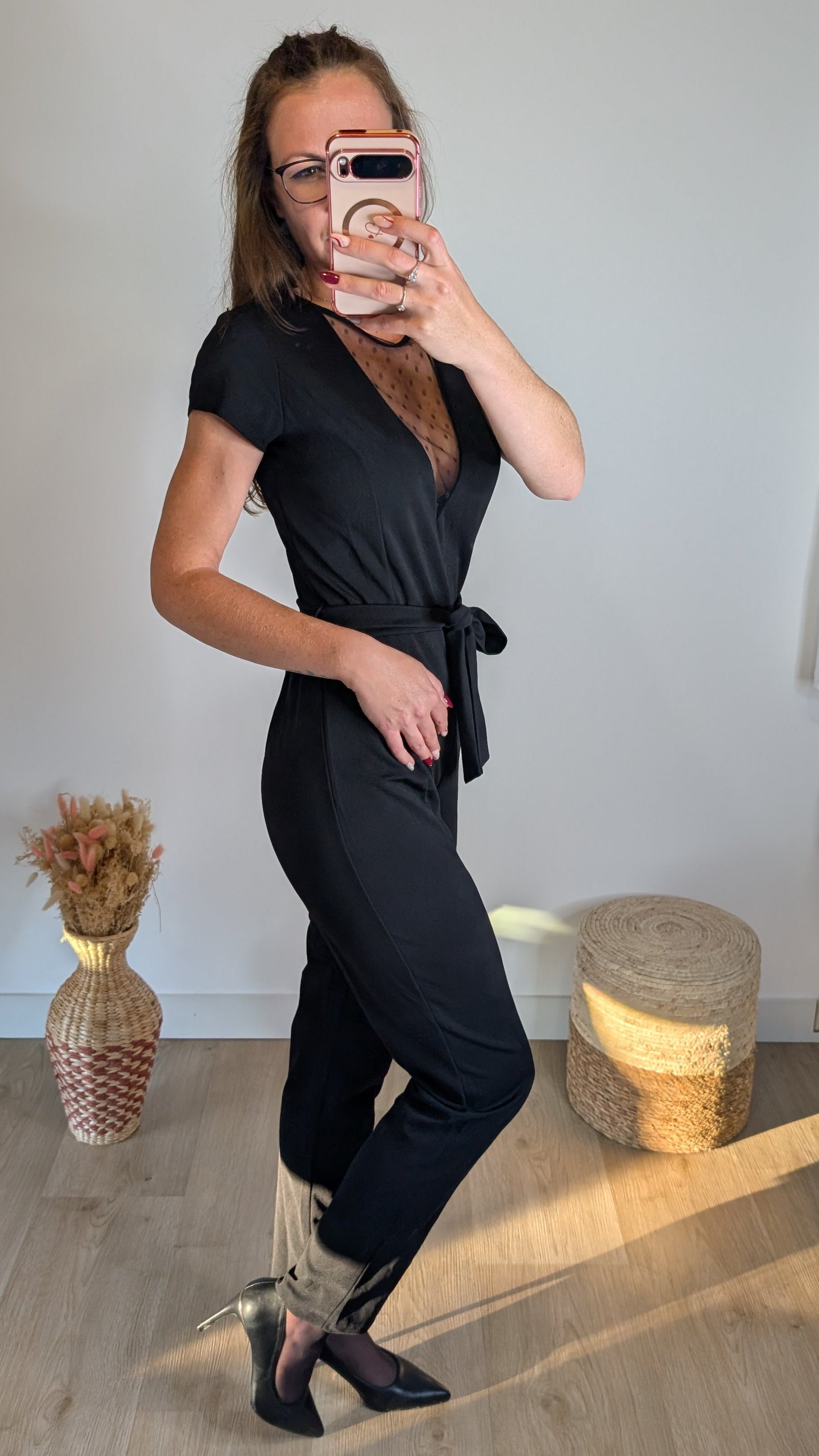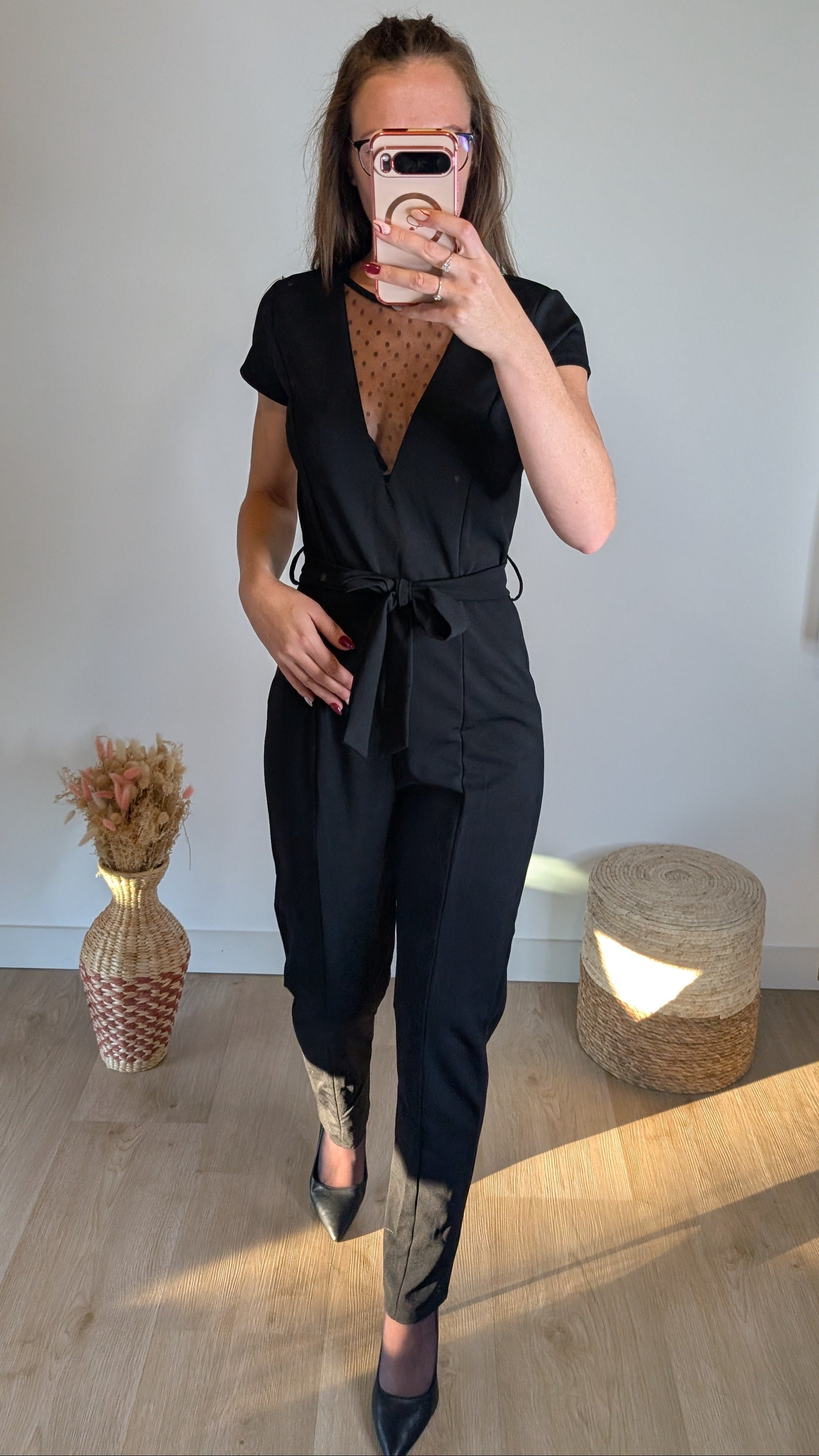 Chic et intemporelle, cette combinaison noire est la pièce parfaite pour sublimer vos soirées comme vos journées élégantes. Sa coupe fluide et ajustée met en valeur la silhouette, tandis que ses détails raffinés apportent une touche de séduction et de modernité.