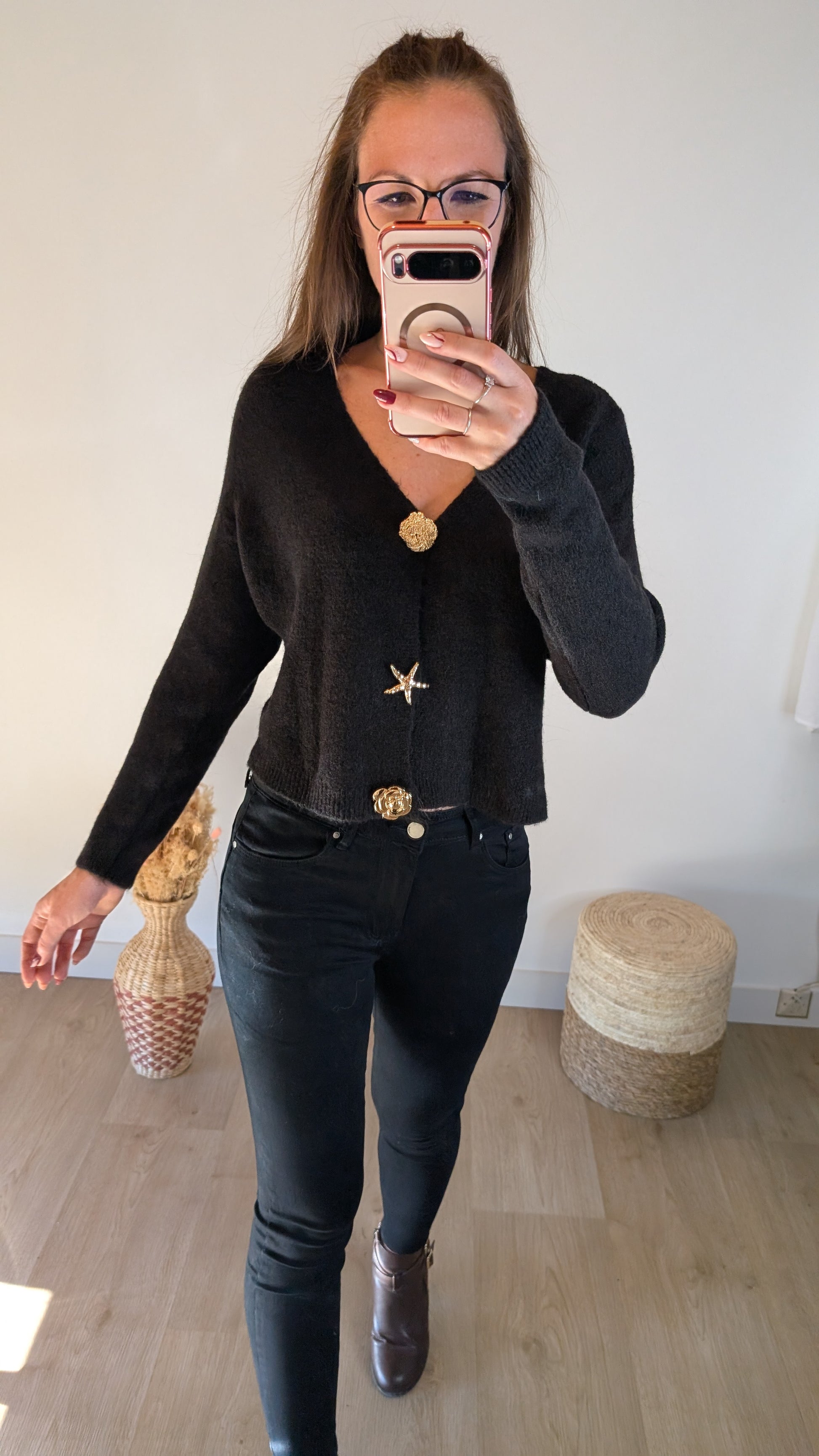 Total look féminin, élégant et chic, ce gilet met en valeur votre tenue grâce à ses broches dorés.