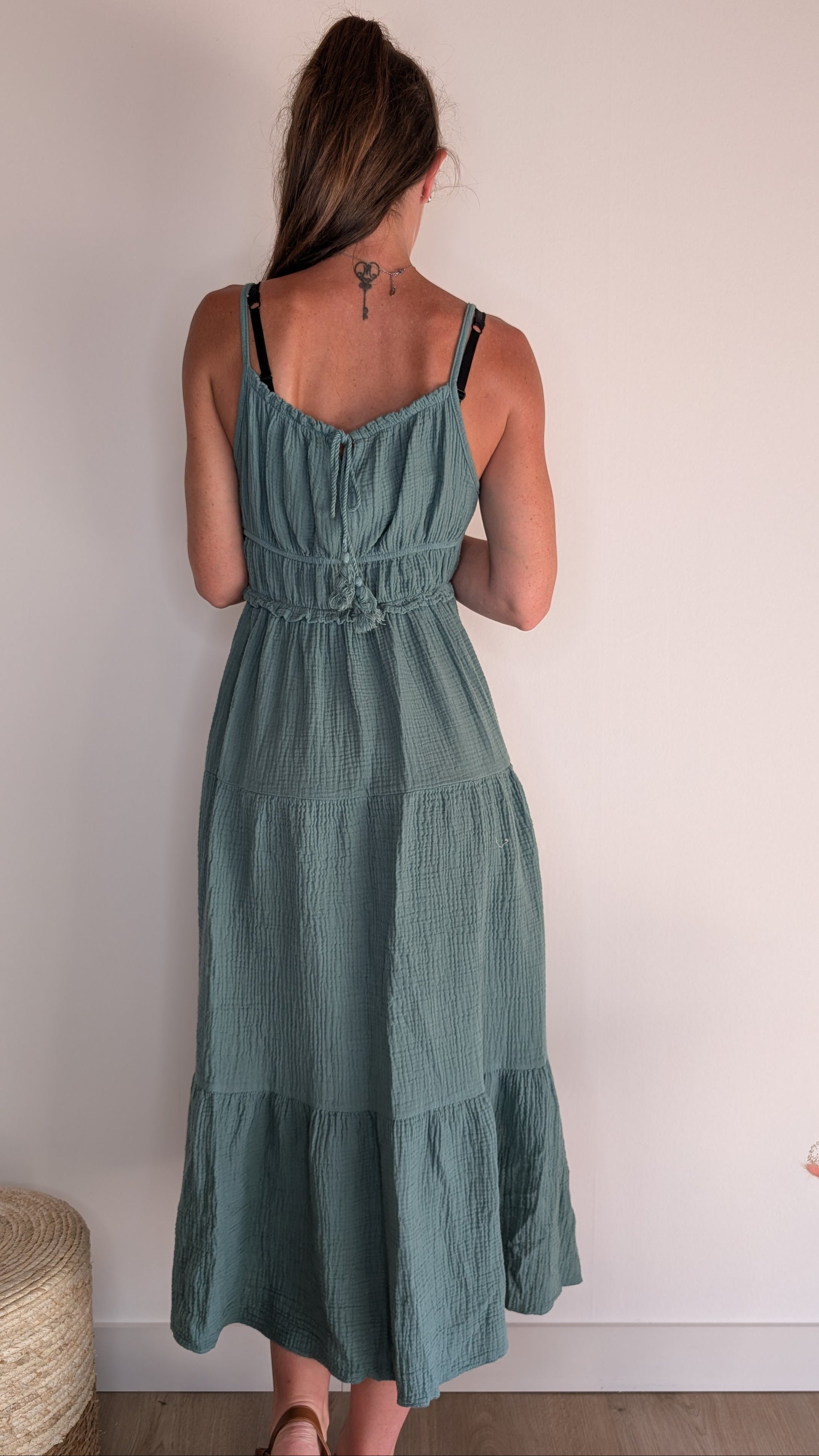 Dotée de plusieurs volants pour un effet aérien et élégant, ainsi que d’un buste subtilement plissé pour plus de texture. Idéale pour un look bohème chic, adaptée aussi bien aux sorties décontractées qu’aux occasions spéciales en été.